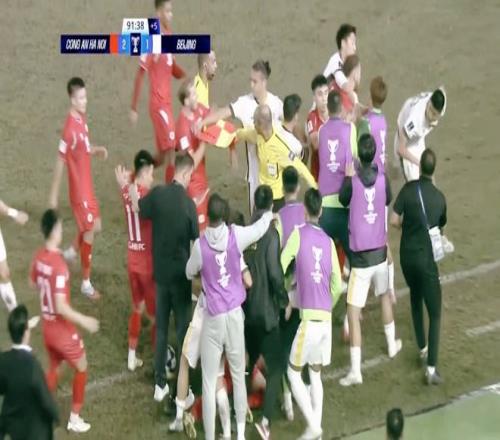 第90分钟,国安中场失误,阿图尔助攻阮廷北,门前推射破门,2:1!进球后的阮廷北疯狂庆祝,堪比夺冠!补时阶段,国安心态失衡,与对手发生大规模冲突,王刚将希纳摁在地上吃到黄牌,而曹永竞因环抱对手颈部,直接被红牌罚下!最终比赛结束,河内凭借着下半场的出色表现,完成逆袭!