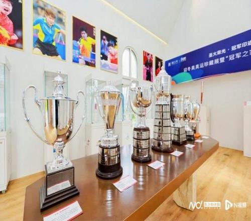香江1号正在展出的七座世乒赛冠军奖杯。