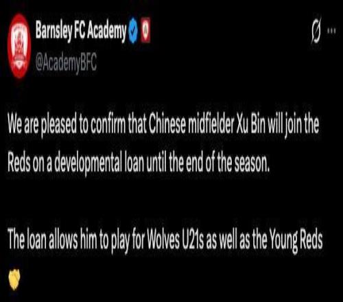 巴恩斯利青训学院的官方公告是:“我们很高兴地确认,中国中场球员徐彬将作为发展性租借球员加盟巴恩斯利,租借期将持续至本赛季结束。这笔租借将允许他同时代表狼队U21及巴恩斯利青年队出战。”